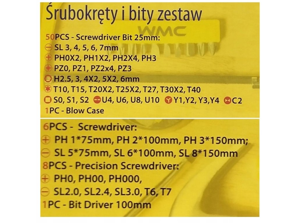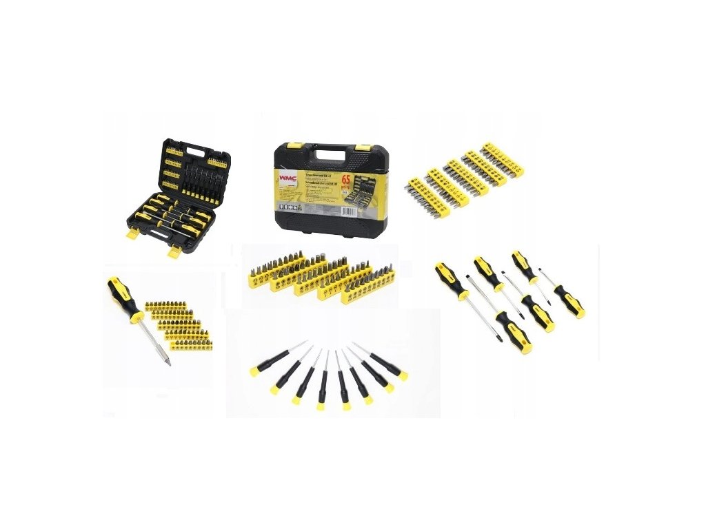 Set izvijačev in bitov WMC vsebuje 65 visokokakovostnih kosov. Delovne konice so toplotno obdelane, kar zagotavlja ustrezno trdoto in odpornost proti upogibanju. Izvijači imajo magnetne nastavke. Ročaji preprečujejo drsenje v roki in so odporni na kemikalije, olja in maziva. Skupaj z 8 natančnimi izvijači in 50 biti različnih oblik in velikosti so vsi deli shranjeni v praktičnem kovčku, ki olajša prenašanje in shranjevanje.