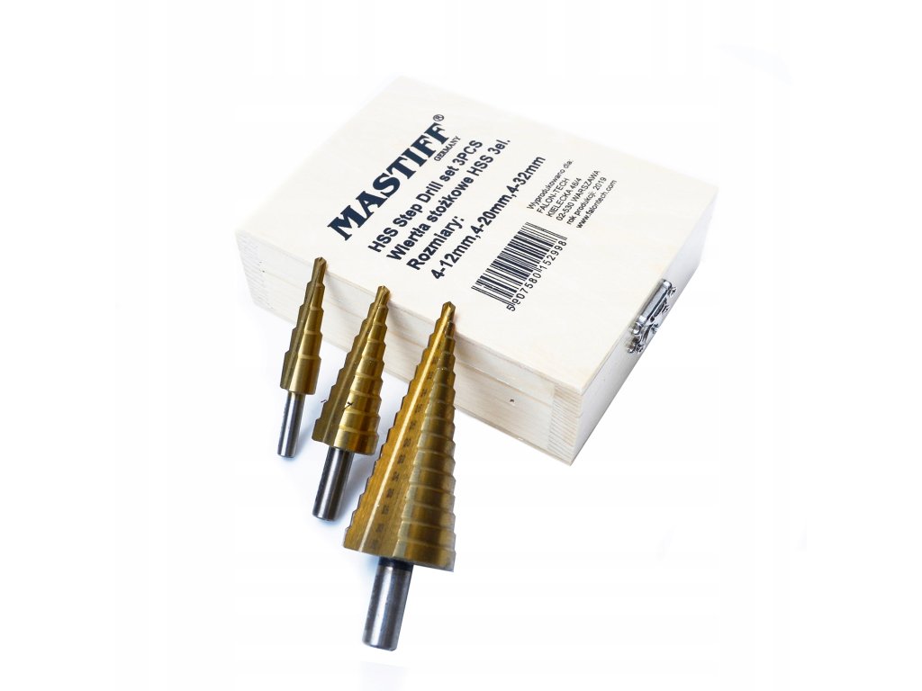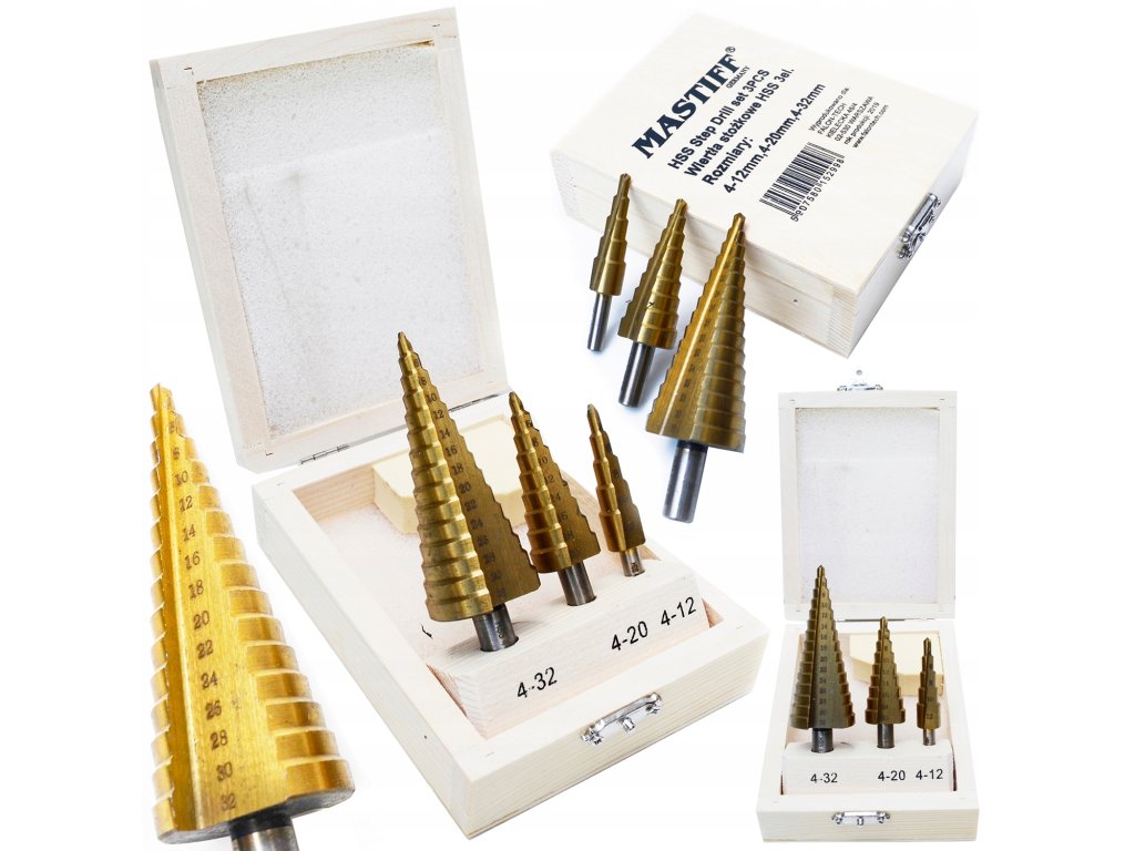 Komplet treh visokokakovostnih stopničastih stožčastih svedrov, izdelanih iz hitroreznega jekla HSS in prevlečenih s titanovo plastjo. Ti svedri so namenjeni vrtanju v kovine, tankostenske jeklene pločevine in plastiko. Svedri se odlikujejo po visoki natančnosti, dolgi življenjski dobi in sposobnosti vrtanja v tanke materiale brez predhodnega predvrtanja, brez britev in brez prijemanja ostružkov na sveder.