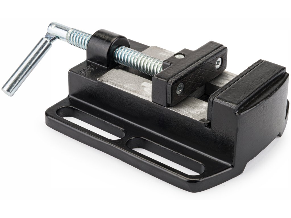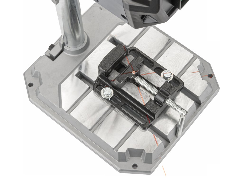 Vrtalnik ima stabilno, močno in nastavljivo delovno mizo ter strojni primež.