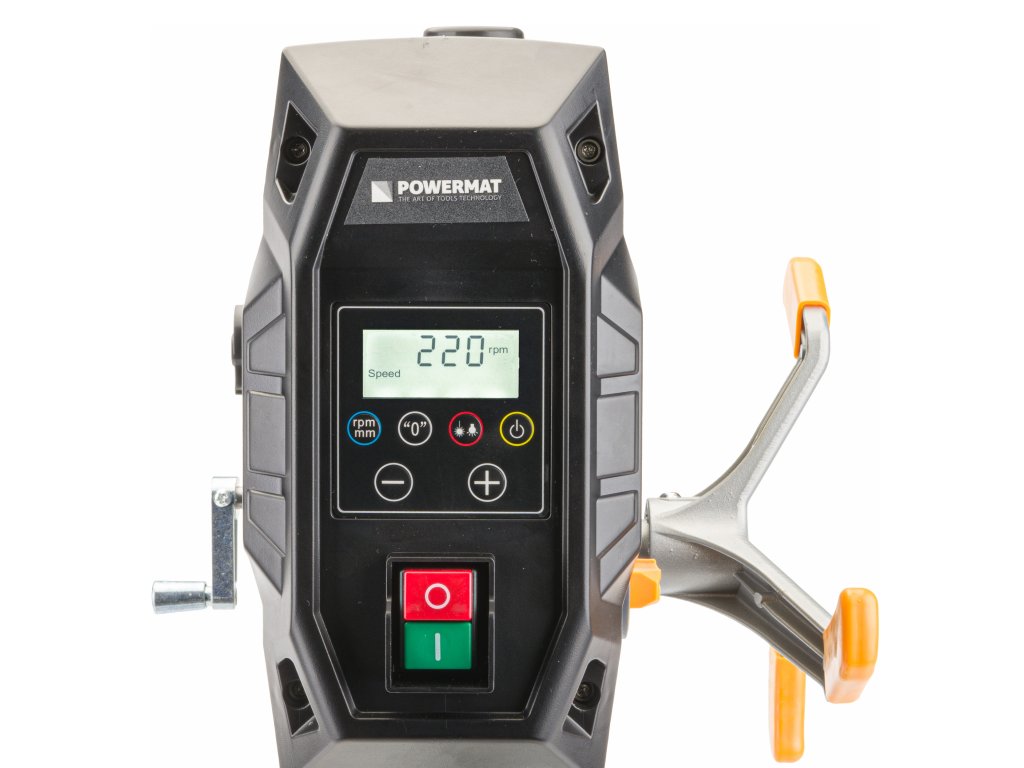 Gumbi na nadzorni plošči omogočajo regulacijo vrtljajev, nadzor globine vrtanja, nastavitev ničelne točke, vklop laserja in osvetlitve delovnega mesta.