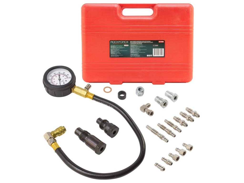 Profesionalni komplet za merjenje kompresijskega tlaka znamke Rockforce v valjih dizelskih motorjev. Meritve je mogoče izvesti preko svečk za predgretje ali preko injektorjev. Primeren je za večino znamk osebnih, dostavnih in tovornih vozil, vključno z avtomobili z motorji TDI/HDI/SDI/DTI/JTD/DID z neposrednim in posrednim vbrizgavanjem. Komplet vsebuje številne adapterje in je primeren za večino znamk avtomobilov: