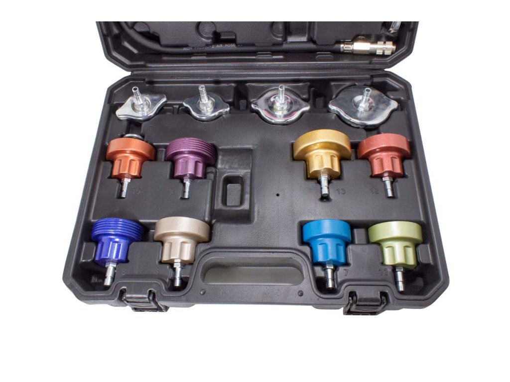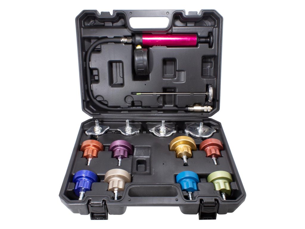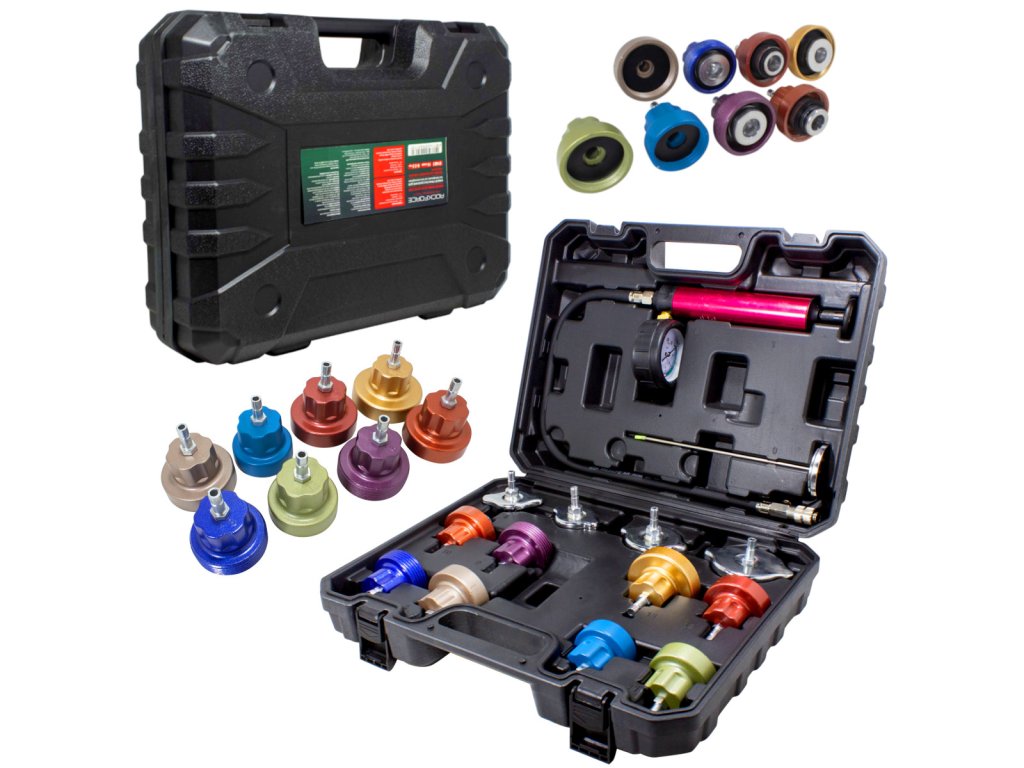 Komplet služi za kontrolo in ugotavljanje tesnosti hladilnega sistema in ogrevanja pri osebnih, dostavnih in tovornih vozilih.