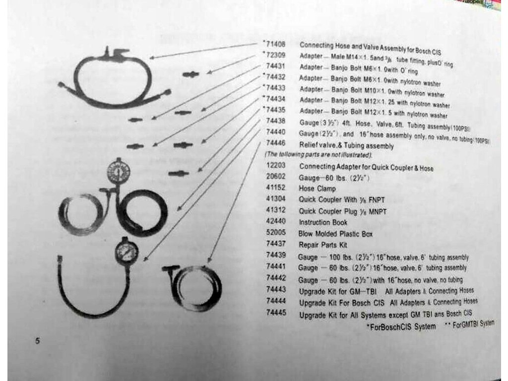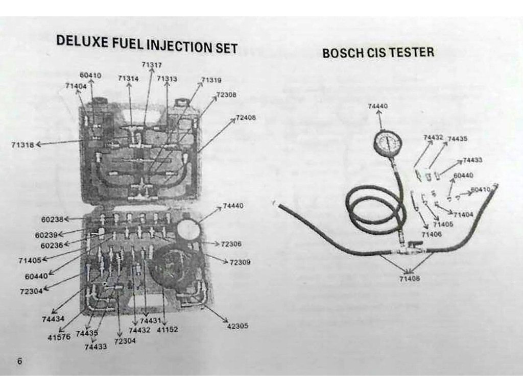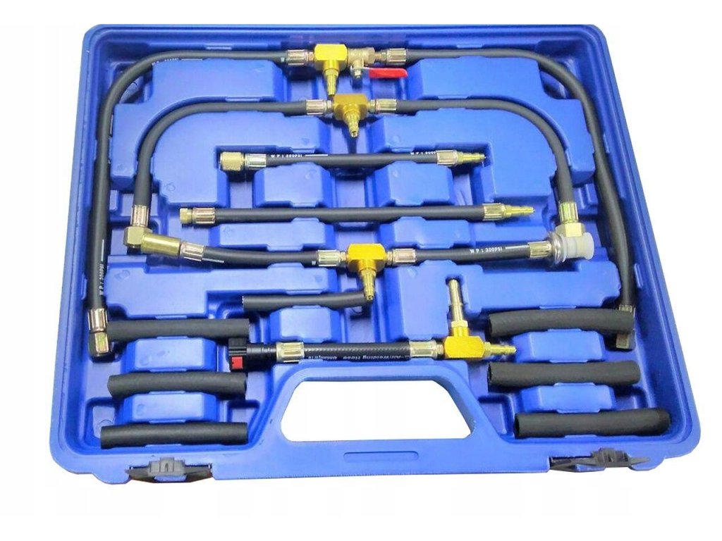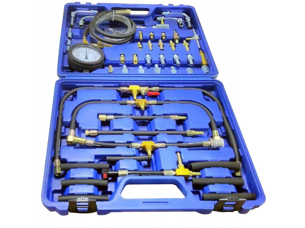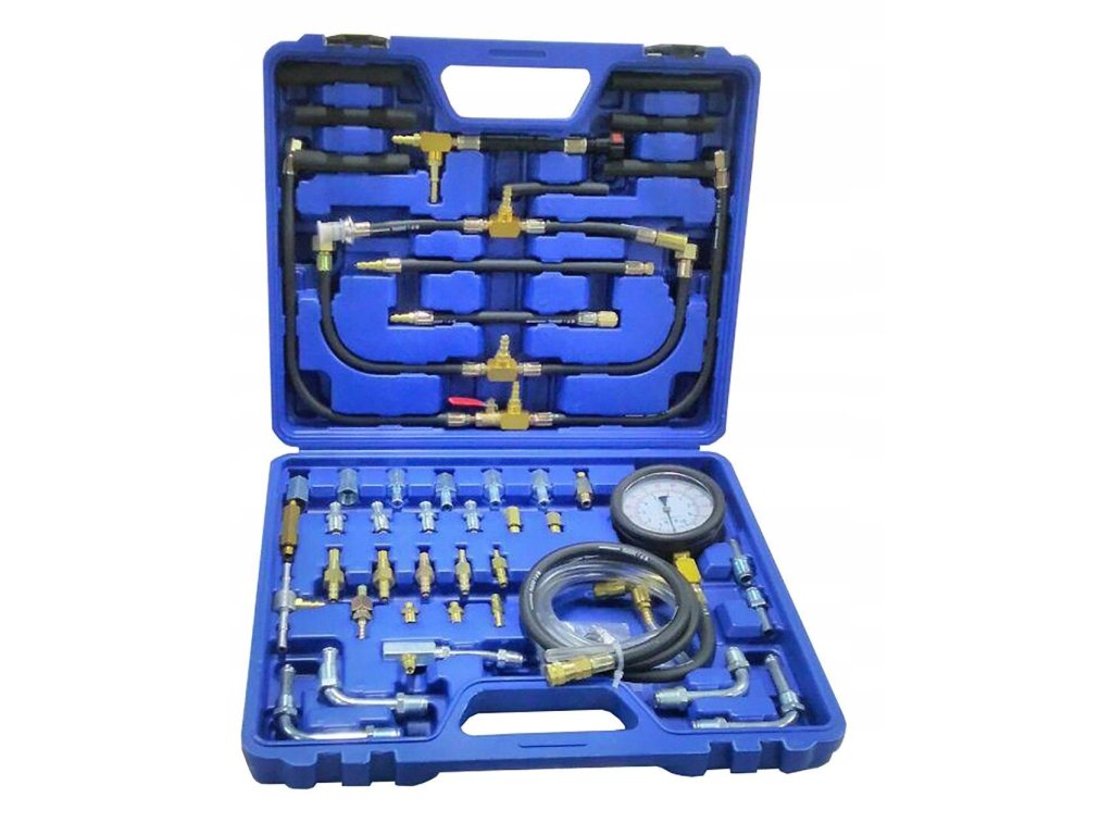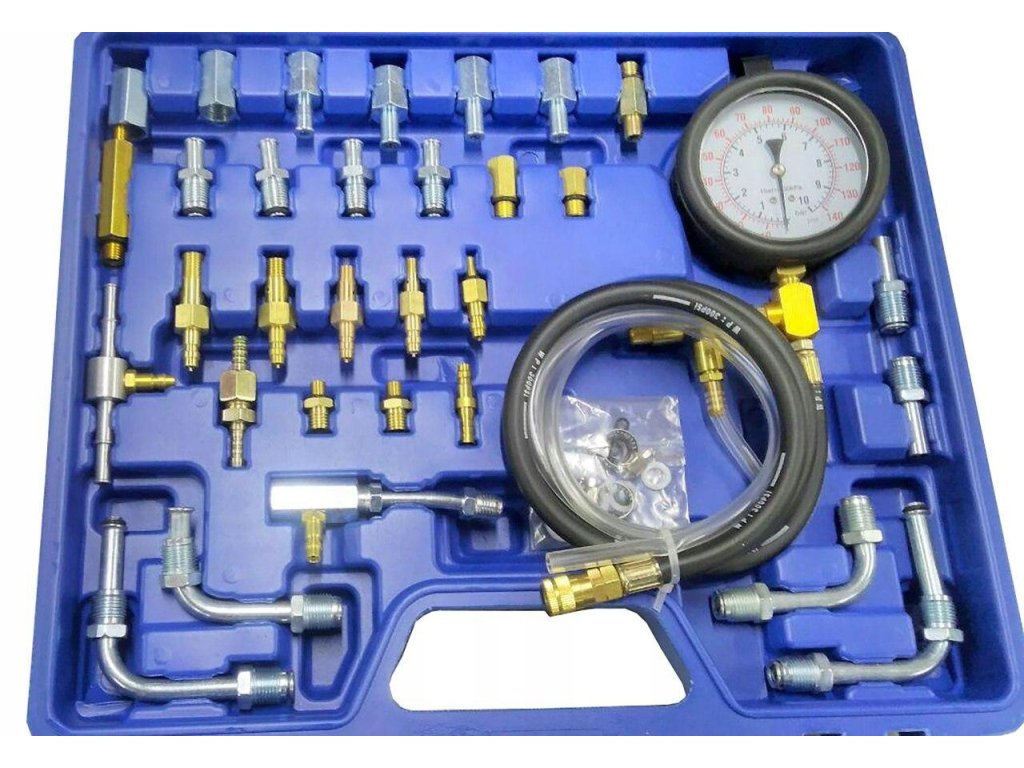 Komplet za testiranje injekcijskih sistemov v bencinskih motorjih, obseg do 140 PSI / 10 bar. Za sisteme: K- in KE-Jetronic sis, KE-Jetronic kic, L-Jetronic liw, merjenje tlaka v gorivnih črpalkah, merjenje povratnega tlaka. Tester služi za merjenje tlaka bencina v gorivnem sistemu motorjev večine znamk.