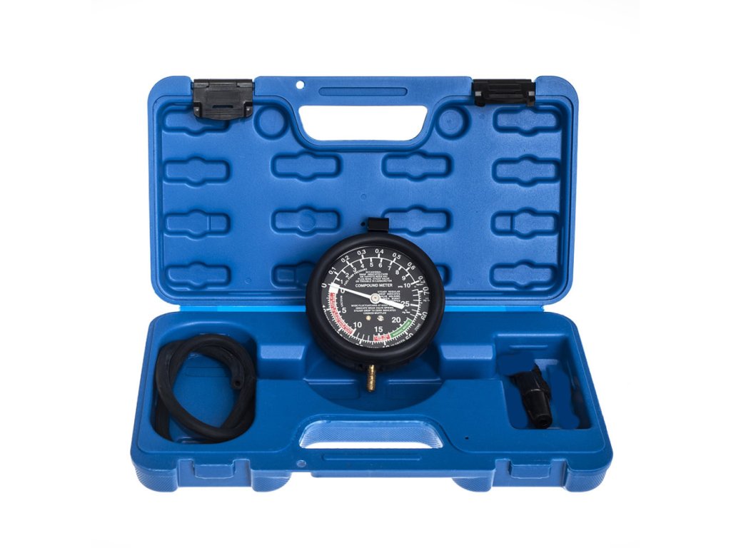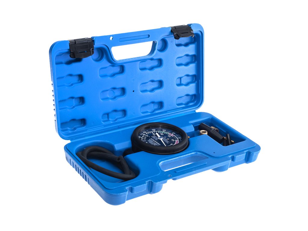 Merilnik tlaka gorivnih črpalk in vakuometer je nepogrešljivo orodje za vse, ki se ukvarjajo z diagnostiko motorjev. Ta profesionalni merilnik je dobavljen v kompaktnem kovčku z 8 kosi potrebnega pribora.