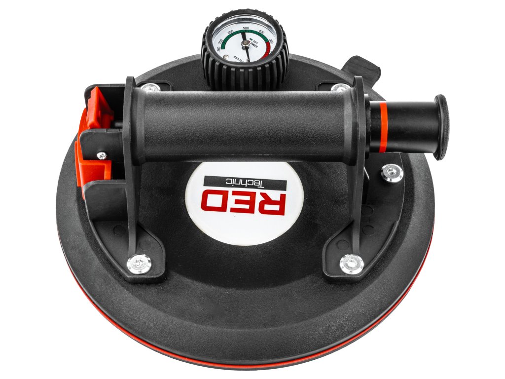 Držalo je opremljeno z analogni manometer, ki omogoča odčitavanje in nadzor tlaka med gumo sesalke in prenašanim elementom. Zaradi berljive lestvice imate popolno gotovost, da boste vedno vedeli, kdaj držalo začne izgubljati oprijem in zahteva odsesavanje zraka.