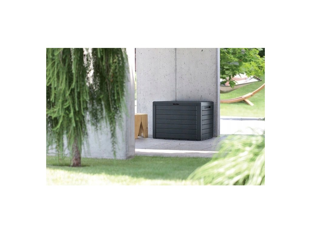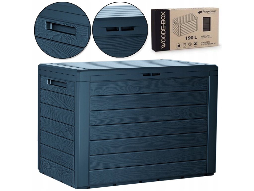Praktičen shranjevalni zaboj z volumnom 190 litrov, idealen za shranjevanje vrtnega orodja, blazin, vrtnih cevi in drugih predmetov. Zaboj je izdelan iz odporne plastike z dizajnom, ki spominja na lesene deske. Zaradi svoje konstrukcije ščiti shranjene stvari pred prahom in dežjem ter je primeren za uporabo na balkonu, terasi, vrtu, v garaži ali delavnici.